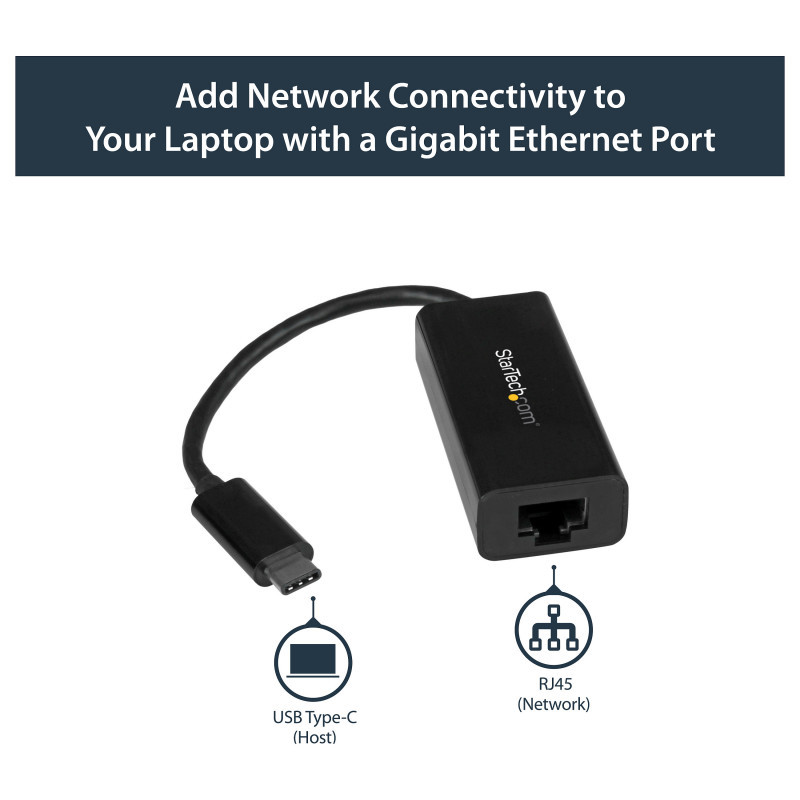 "StarTech.com USB-C to Gigabit Ethernet Adapter - Black. Connectivity technology: Wired, Host interface: USB, Interface: Ethernet. Maximum data transfer rate: 5000 Mbit/s. USB powered. Product colour: Black"\n"USB-C Network Adapter | 10/100/1000Mbps | Thunderbolt™ 3 Compatible | RJ45
