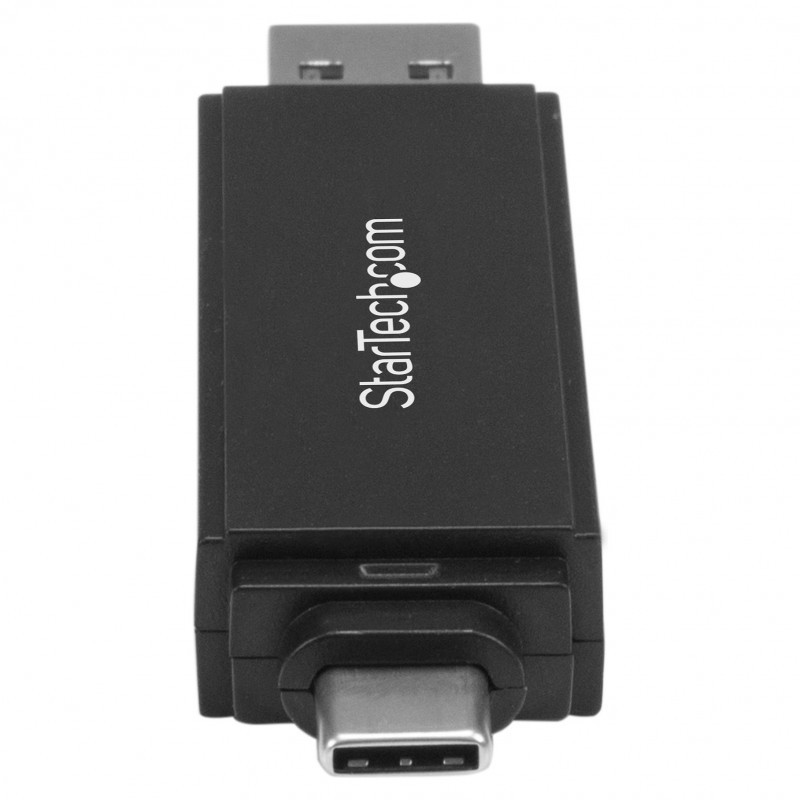 "StarTech.com USB 3.0 Memory Card Reader/Writer for SD and microSD Cards - USB-C and USB-A. Compatible memory cards: MMC, MicroSD (TransFlash), MicroSDHC, MicroSDXC, SD, SDHC, SDXC, Product colour: Black, Data transfer rate: 5000 Mbit/s. Interface: USB 3.2 Gen 1 (3.1 Gen 1) Type-A/Type-C. Width: 20 mm, Depth: 78 mm, Height: 11 mm. Package width: 70 mm, Package depth: 105 mm, Package height: 20 mm. Products per master (outer) case: 100 pc(s), Master (outer) case width: 290 mm, Master (outer) case length: 425 mm"\n"Access multiple types of flash memory cards on your USB-C or USB-A enabled smartphone, tablet, laptop or desktop computer