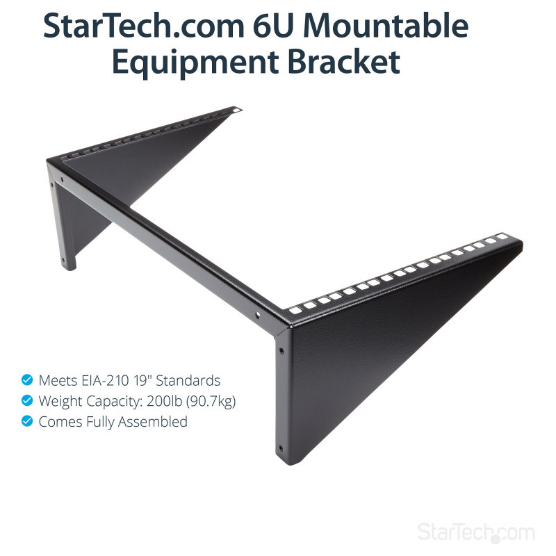 "StarTech.com Vertical Wall-Mount Server Rack - Solid Steel - 6U. Type: Wall mounted rack, Rack capacity: 6U, Maximum weight capacity: 90.7 kg. Weight: 1.3 kg. Product colour: Black"\n"Mount server, network or telecommunications devices vertically with this 6U wall-mountable rack