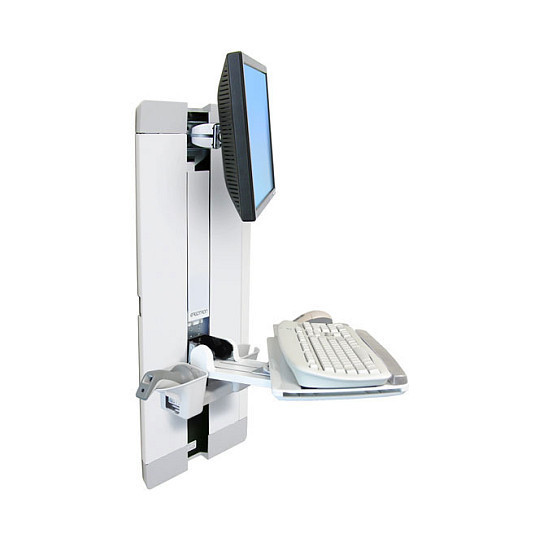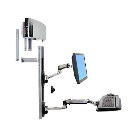 The mechanical springs in the monitor and keyboard arms enable independent toolless height adjustment of up to 12.4in (31.5cm) with effortless one-touch motion. For additional adjustments, reposition the arms along the wall track (2.8ft / 88cm) for a different height range.