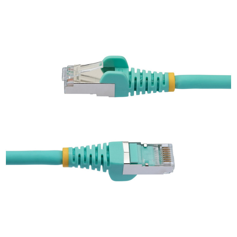 "StarTech.com 1.5m CAT6a Ethernet Cable - Aqua - Low Smoke Zero Halogen (LSZH) - 10GbE 500MHz 100W PoE++ Snagless RJ-45 w/Strain Reliefs S/FTP Network Patch Cord. Cable length: 1.5 m, Cable standard: Cat6a, Cable shielding: S/FTP (S-STP), Connector 1: RJ-45, Connector 2: RJ-45, Data transfer rate: 10000 Mbit/s, Product colour: Aqua colour"\n"LSZH | 10GbE | 100W PoE++ | Snagless RJ-45