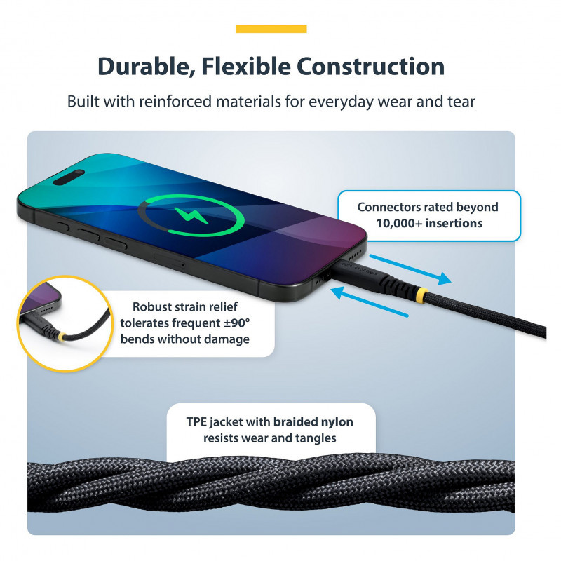 The USB-C Charging Cable features a TPE inner jacket with a braided nylon exterior for optimal flexibility and wear protection. The durable nickel-plated connectors are designed for frequent daily use, and are rated to operate beyond 10,000 insertion cycles.