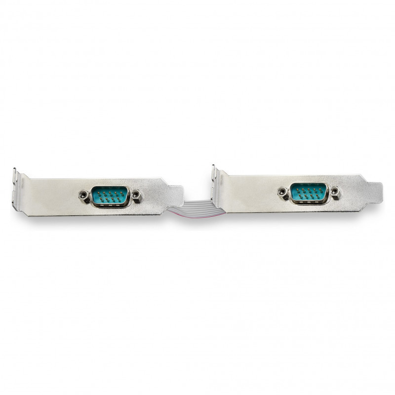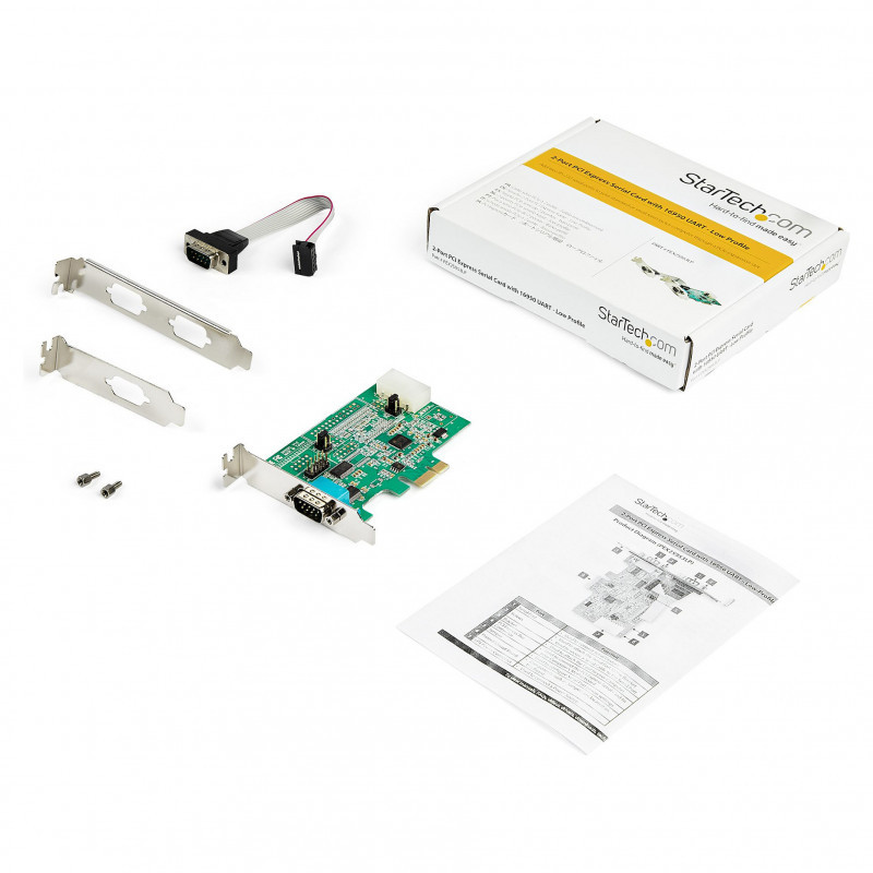 "StarTech.com 2-port PCI Express RS232 Serial Adapter Card - PCIe RS232 Serial Host Controller Card - PCIe to Serial DB9 - 16950 UART - Low Profile Expansion Card - Windows & Linux. Host interface: Mini PCI Express, Output interface: Serial, Expansion card standard: PCIe 1.1. Mean time between failures (MTBF): 222366 h, Certification: CE, FCC. Chipset: Asix AX99100, Baud rate: 921.6 Kbit/s, FIFO (First In, First Out): 256 B. Windows operating systems supported: Windows 10, Windows 10 Education, Windows 10 Education x64, Windows 10 Enterprise, Windows 10..., Server operating systems supported: Windows Server 2003, Windows Server 2008 R2, Windows Server 2012, Windows Server 2012 R2, Windows.... Width: 67 mm, Depth: 98 mm, Height: 18 mm"\n"PCI Express to Serial Adapter | 921.4Kbps | Windows® and Linux® Compatible
