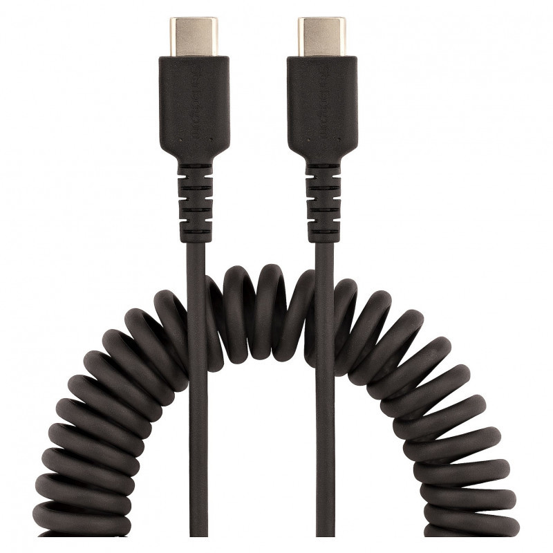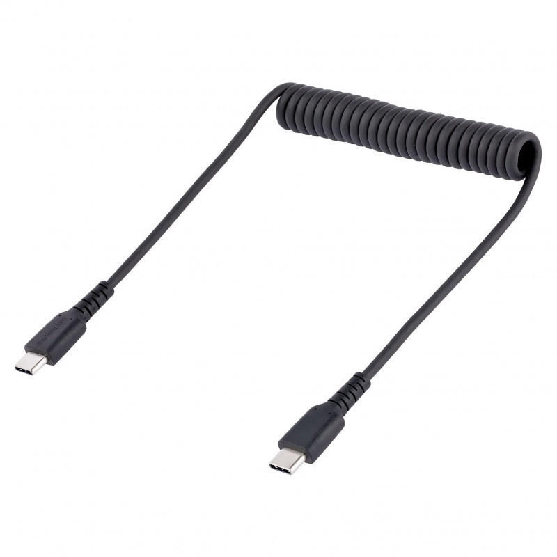 "StarTech.com 20in (50cm) USB C Charging Cable, Coiled Heavy Duty Fast Charge & Sync USB-C Cable, USB 2.0 Type-C Cable, Rugged Aramid Fiber, Durable Male to Male USB Cable, Black. Cable length: 0.5 m. Connector 1: USB C, Connector 2: USB C, USB version: USB 2.0, Maximum data transfer rate: 0.48 Gbit/s, Connector contacts plating: Nickel, Product colour: Black"\n"20in/50cm USB C Charging Cable, Heavy Duty Coiled USB 2.0