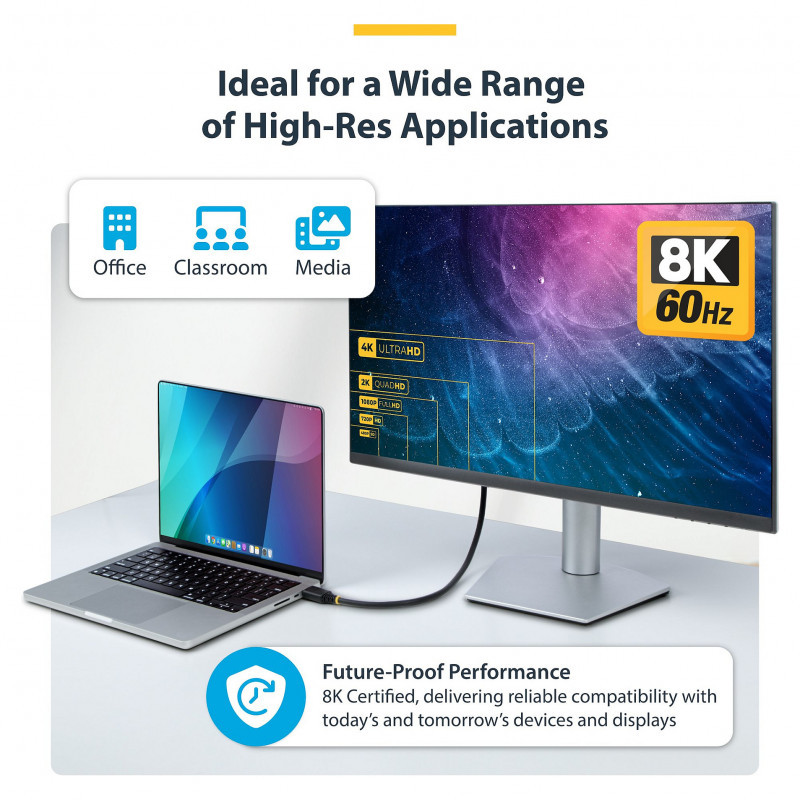 Drive sharp 8K video, fast refresh rates, and high-resolution visuals on UHD displays, workstations, video walls, and AV installations. This Ultra High Speed HDMI 2.1 cable supports 8K at 60Hz, 5K at 60Hz, 4K at 120Hz, and up to 48Gbps bandwidth for consistent, reliable signal quality.