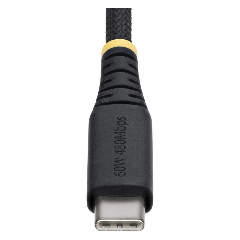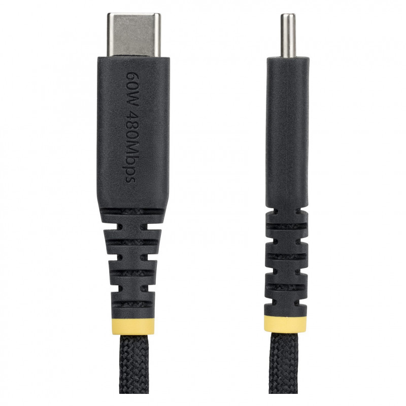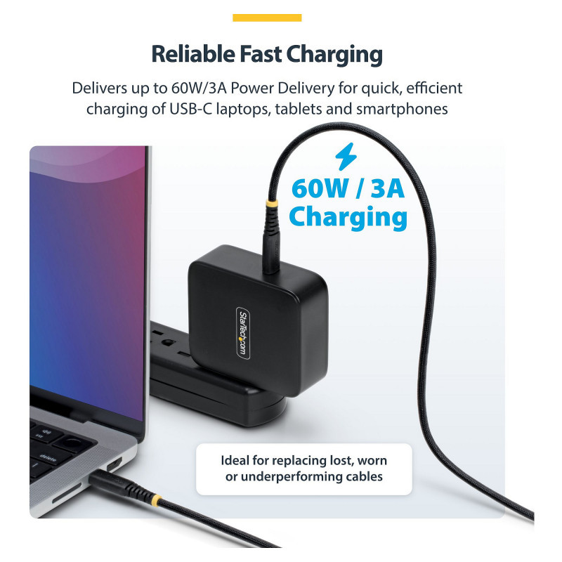 "StarTech.com 30cm (1ft) USB-C Charging Cable, 60W (3A) PD, Dual-Layer Braided Nylon/TPE Jacket, Rugged USB C Charging Cord, USB 2.0 Laptop Charger Cable. Cable length: 0.3 m. Connector 1: USB C, Connector 2: USB C, USB version: USB 2.0, Maximum data transfer rate: 0.48 Gbit/s, Connector contacts plating: Nickel, Product colour: Black"\n"Connect a USB Type-C device to a USB-C wall charger or host computer