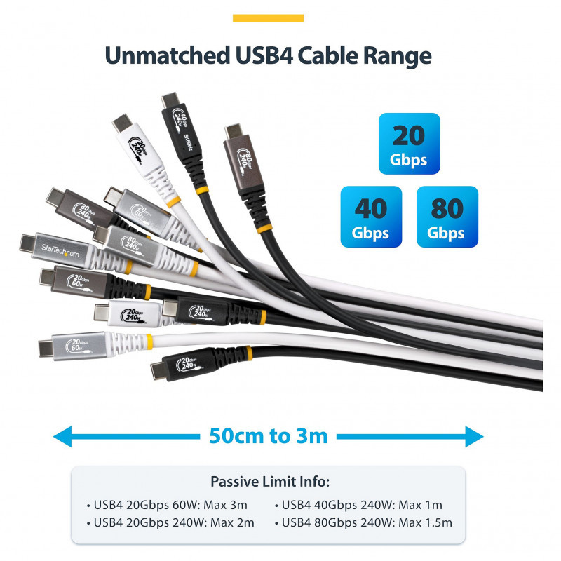 "StarTech.com 3m (10ft) USB4 Cable, 20Gbps, USB-IF Certified USB-C Cable, 60W PD, 4K 120Hz DP 2.1, TPE Jacket, Black USB-C Cord. Cable length: 3 m. Connector 1: USB C, Connector 2: USB C, USB version: USB4 Gen 2x2, Maximum data transfer rate: 20 Gbit/s, Product colour: Black"\n"Use this USB-IF Certified USB-C cable for fast and reliable connections to your USB4 devices