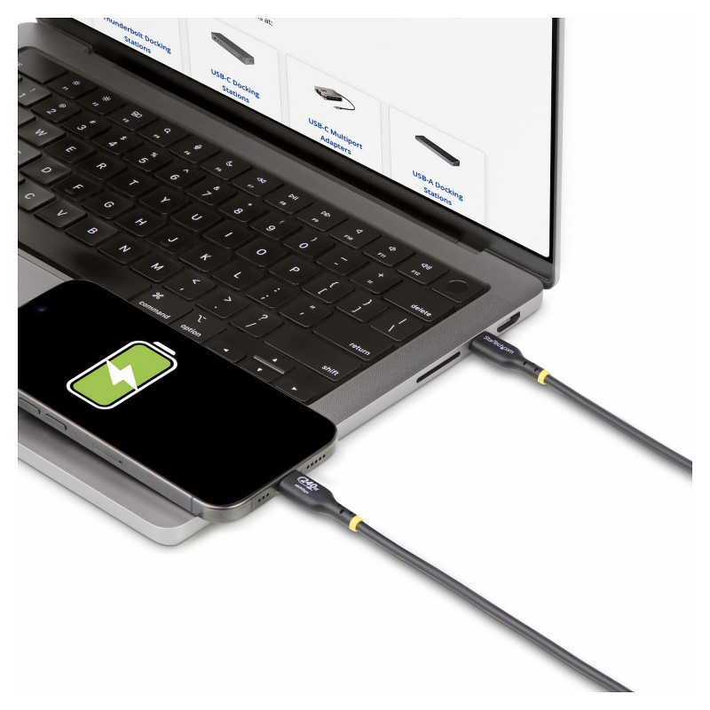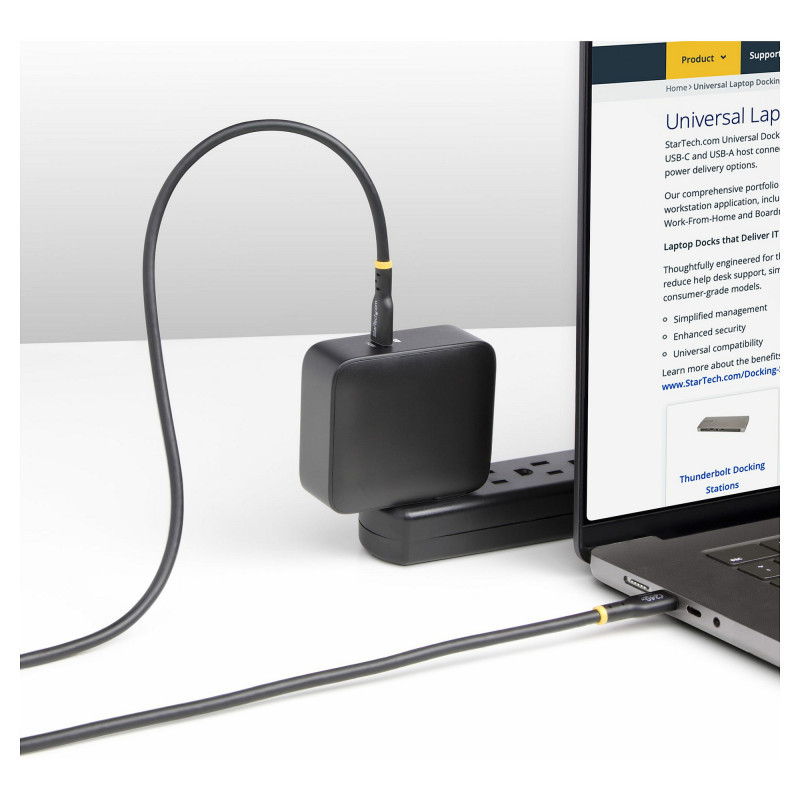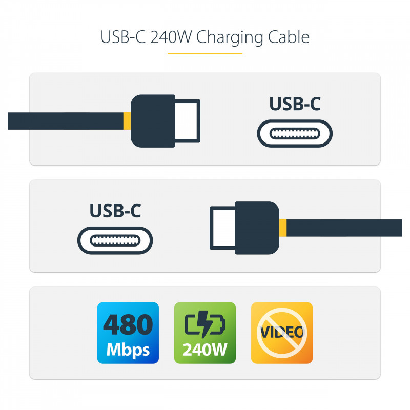 "StarTech.com 4m USB-C Charging Cable, USB-IF Certified USB C Cable, 240W PD EPR, USB 2.0 Type-C Laptop Charger Cord, USB-C Data Transfer Cable, TPE Jacket, M/M. Cable length: 4 m. Connector 1: USB C, Connector 2: USB C, USB version: USB 2.0, Maximum data transfer rate: 0.48 Gbit/s, Connector contacts plating: Nickel, Product colour: Black"\n"Charge high performance USB-C devices at up to 240W Extended Power Range (EPR)