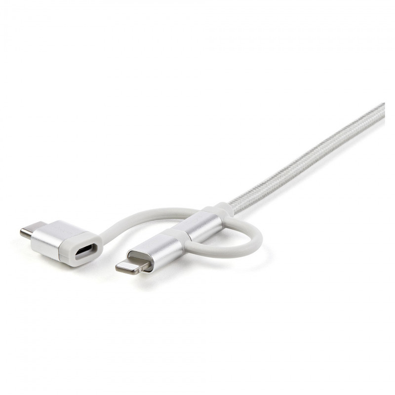 "StarTech.com 1 m (3 ft.) USB Multi Charging Cable - USB to Micro-USB or USB-C or Lightning for iPhone / iPad / iPod / Android - Apple MFi Certified - 3 in 1 USB Charger - Braided. Cable length: 1 m. Connector 1: USB A, Connector 2: Micro-USB B, USB version: USB 2.0, Maximum data transfer rate: 0.48 Gbit/s, Connector contacts plating: Nickel, Product colour: Silver"\n"3-in-1 USB Charger Cable | Braided | Apple MFi Certified | USB 2.0