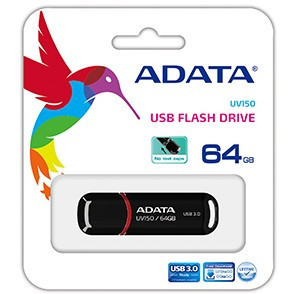 "ADATA 64GB DashDrive UV150. Capacity: 64 GB, Device interface: USB Type-A, USB version: 3.2 Gen 1 (3.1 Gen 1). Form factor: Cap. Weight: 9 g. Product colour: Black"\n"The UV150 combines a classic look with economical pricing, a SuperSpeed USB 3.0 interface, and an attractive pearlescent exterior. Arriving in colors of striking scarlet and glistening onyx, its minimalist and modern design make it a fashionable and practical accessory both in and out of town.