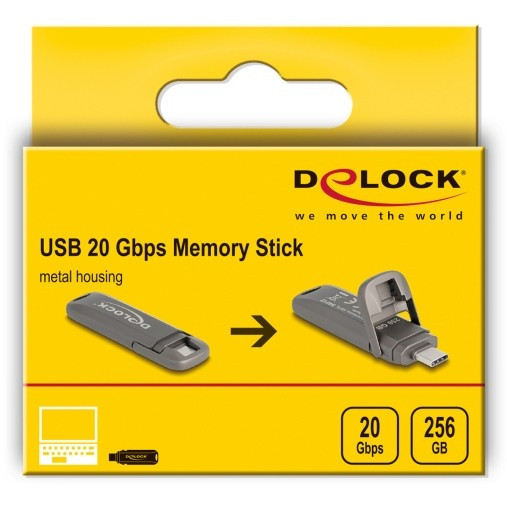 "DeLOCK 54012. Capacity: 256 GB, Device interface: USB Type-C, Read speed: 1980 MB/s. Form factor: Capless. Weight: 34 g. Product colour: Grey"\n"Description