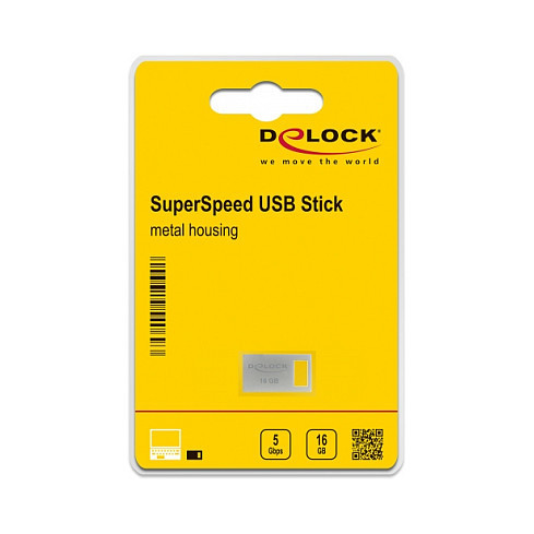 "DeLOCK USB 5 Gbps Memory Stick 16 GB - Metal Housing. Capacity: 16 GB, Device interface: USB Type-A, USB version: 3.2 Gen 1 (3.1 Gen 1), Read speed: 113 MB/s, Write speed: 63 MB/s. Form factor: Capless, Product colour: Silver"\n"This USB memory stick by Delock can be used to save and transport data, e.g. photos, videos or music. Due to the stylish design with eyelet, the small USB memory stick can be easily attached to the key ring for transport.