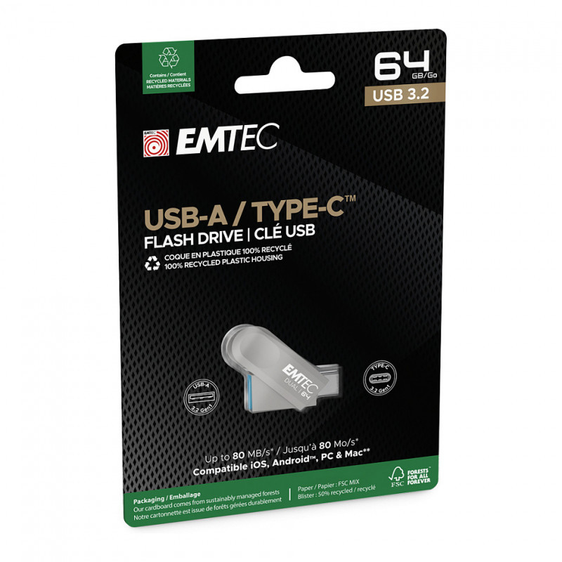 "Emtec D280 Dual. Capacity: 64 GB, Device interface: USB Type-A / USB Type-C, USB version: 3.2 Gen 1 (3.1 Gen 1). Form factor: Swivel, Product colour: Silver"\n"Easy transfer of all your files from one device to another with the D280 Dual USB-A USB-C Drive. Opt for convenience."
