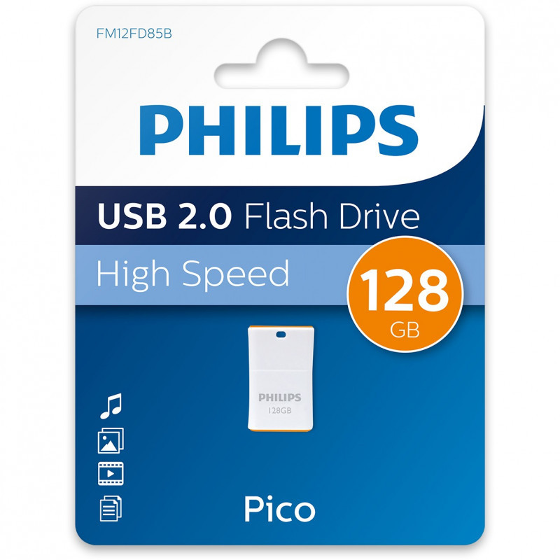 "Philips Pico. Capacity: 128 GB, Device interface: USB Type-A, USB version: 2.0, Read speed: 30 MB/s, Write speed: 20 MB/s. Form factor: Cap, Product colour: Orange, White"\n"Philips USB 2.0 Pico