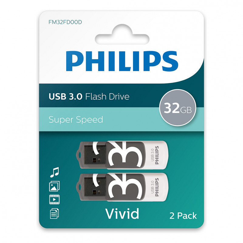 "Philips Vivid. Capacity: 64 GB, Device interface: USB Type-A, USB version: 3.2 Gen 1 (3.1 Gen 1), Read speed: 100 MB/s, Write speed: 25 MB/s. Form factor: Cap, Product colour: Grey, White"\n"Philips USB 2.0 Moon