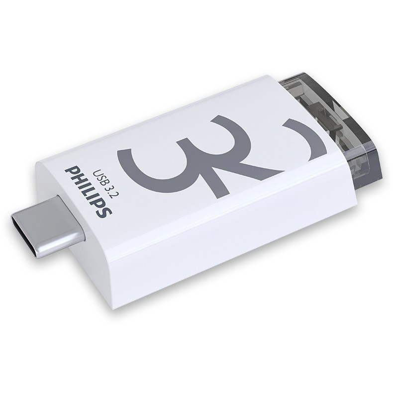 "Philips Click. Capacity: 32 GB, Device interface: USB Type-C, USB version: 3.2 Gen 1 (3.1 Gen 1), Read speed: 120 MB/s, Write speed: 50 MB/s. Form factor: Cap, Product colour: Transparent, White"\n"Philips USB 3.2 Click
