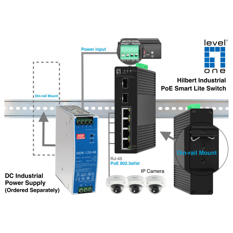 "LevelOne Hilbert 6-Port Industrial Gigabit PoE Smart Lite Switch, 2 x SFP, 4 PoE Outputs, 802.3at/af PoE. Switch type: Managed, Switch layer: L2. Basic switching RJ-45 Ethernet ports type: Gigabit Ethernet (10/100/1000), Basic switching RJ-45 Ethernet ports quantity: 4. Full duplex. MAC address table: 2000 entries, Switching capacity: 12 Gbit/s. Networking standards: IEEE 802.1D, IEEE 802.1Q, IEEE 802.1p, IEEE 802.1w, IEEE 802.3, IEEE 802.3ab, IEEE 802.3af, IEEE.... DC input voltage: 44 - 57 V. Power over Ethernet (PoE)"\n"The LevelOne IGS-2106P Hilbert Industrial gigabit PoE smart lite switch is a next-generation Ethernet Switch offering powerful better PoE functionality and usability that delivers the cost-effectively business and transports Ethernet services via fiber or copper connections. IGS-2106P delivers 4 (10M/100M/1G) RJ45/PoE+ (Support 802.3at/af) ports and 2 Gigabit SFP ports. With the industrial standard DIN-rail mount, plus the clearly visible status LEDs provide simple monitoring of port link activity.. can be matched with the latest LevelOne IP Locator, the software is the easiest to use switch discovery tool, it can search all Hilbert series switches, instantly know the forgotten IP and other info. Compatible with mainstream Windows and Mac operating systems.