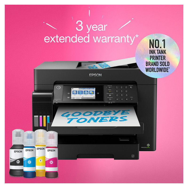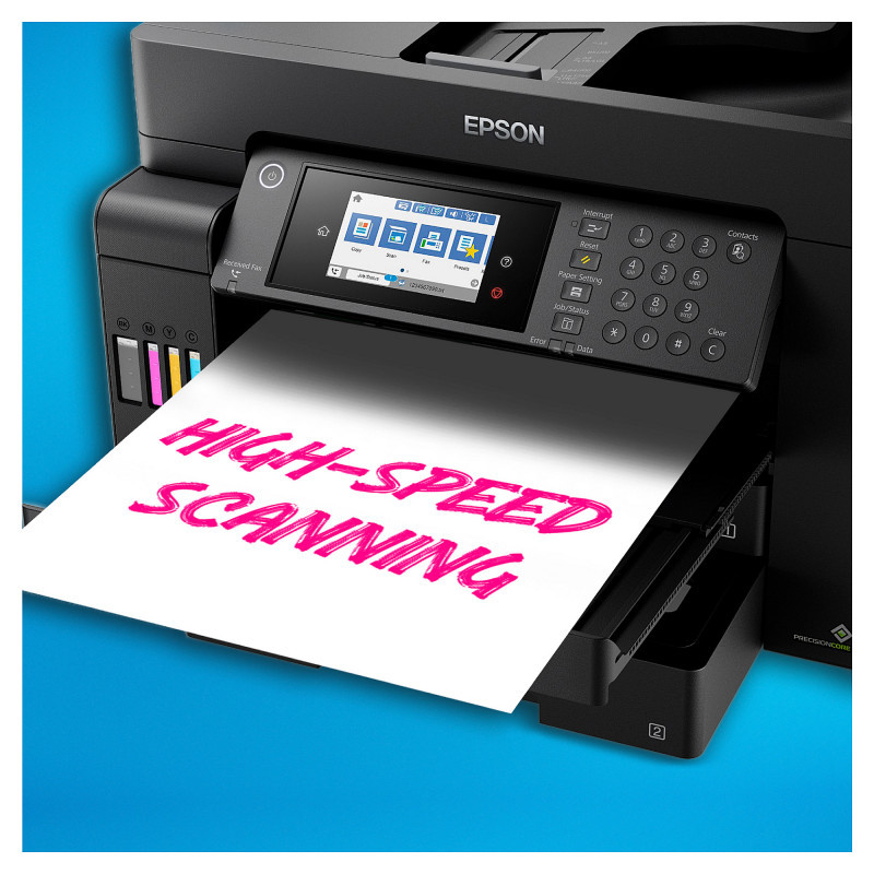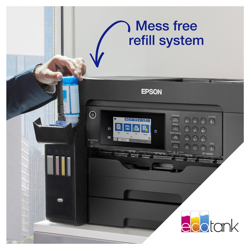 "Epson EcoTank ET-16655. Print technology: Inkjet, Printing: Colour printing, Maximum resolution: 4800 x 1200 DPI, Print speed (colour, normal quality, A4/US Letter): 32 ppm. Copying: Colour copying. Scanning: Colour scanning, Optical scanning resolution: 1200 x 2400 DPI. Faxing: Colour faxing. Duplex functions: Copy, Print, Scan. Maximum ISO A-series paper size: A3. Wi-Fi. Direct printing. Product colour: Black"\n"Get more done in less time