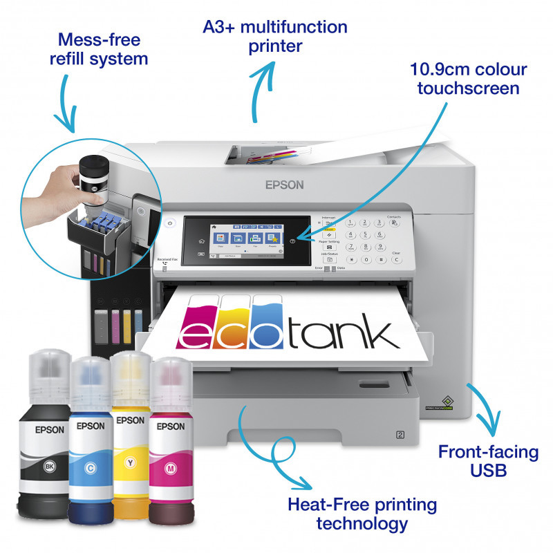 "Epson EcoTank Pro ET-16685. Print technology: Inkjet, Printing: Colour printing, Maximum resolution: 4800 x 1200 DPI, Print speed (colour, normal quality, A4/US Letter): 25 ppm. Copying: Colour copying. Scanning: Colour scanning, Optical scanning resolution: 1200 x 1200 DPI. Faxing: Colour faxing. Duplex functions: Copy, Print, Scan. Maximum ISO A-series paper size: A3. Wi-Fi. Direct printing. Product colour: White"\n"Keep on saving