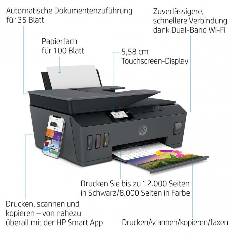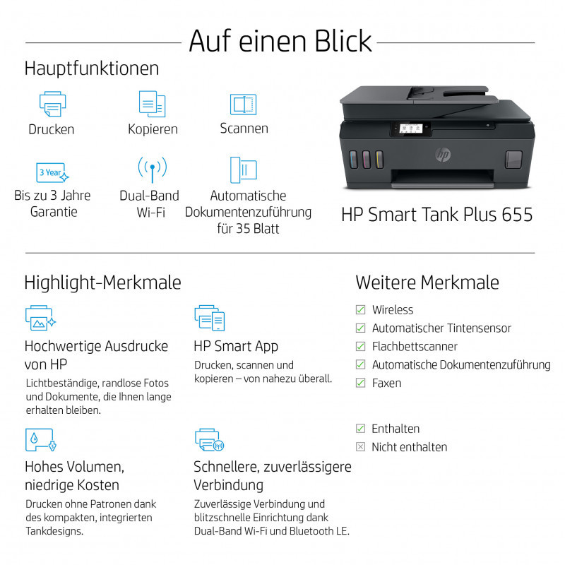 "HP Smart Tank Plus 655 Wireless All-in-One Color Printer, Copier, Scanner. Print technology: Thermal inkjet, Printing: Colour printing, Maximum resolution: 4800 x 1200 DPI, Print speed (colour, normal quality, A4/US Letter): 5 ppm. Copying: Colour copying, Maximum copy resolution: 600 x 600 DPI. Scanning: Colour scanning, Optical scanning resolution: 1200 x 1200 DPI. Faxing: Colour faxing. Duplex functions: Fax. Maximum ISO A-series paper size: A4. Wi-Fi. Direct printing. Product colour: Black"\n
