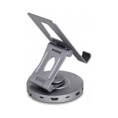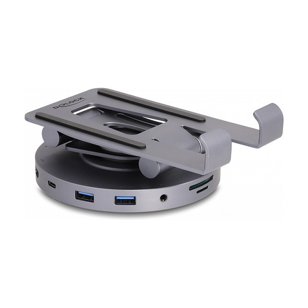 "DeLOCK Tablet and Laptop Docking Station 4K with integrated holder - HDMI / USB / Hub / SD / Micro SD / PD 3.0 - 360° rotateable. Connectivity technology: Wired, Host interface: USB 3.2 Gen 1 (3.1 Gen 1) Type-A + Type-C, Headphone connectivity: 3.5 mm. Product colour: Grey, Compatible memory cards: MicroSD (TransFlash), SD, Maximum digital resolution: 3840 x 2160 pixels. Power cable length: 0.24 m. Windows operating systems supported: Windows 10, Windows 10 x64, Windows 11, Mac operating systems supported: MacOS, Mobile operating systems supported: Android 11.0. Height: 15 mm, Weight: 316 g"\n"Description