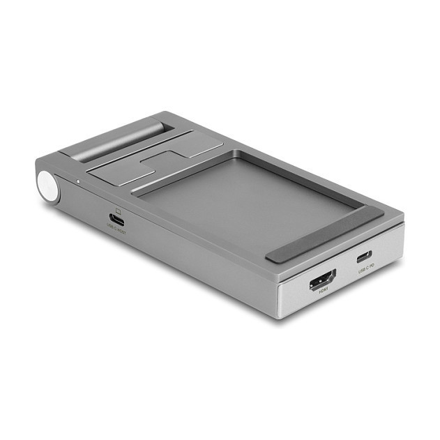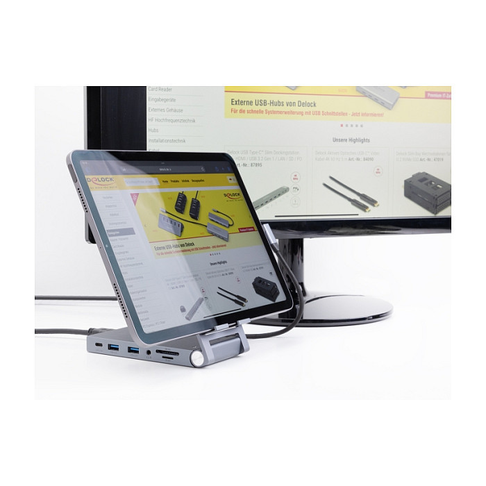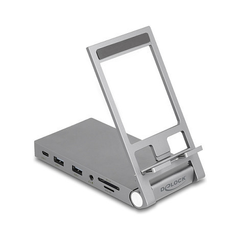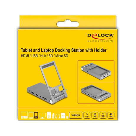 "DeLOCK Tablet and Laptop Docking Station 4K with integrated holder - HDMI / USB / Hub / SD / Micro SD / PD 3.0 - foldable. Connectivity technology: Wired, Host interface: USB 3.2 Gen 1 (3.1 Gen 1) Type-C, USB Power Delivery up to: 60 W. Product colour: Grey, Compatible memory cards: MicroSD (TransFlash), SD, Maximum digital resolution: 3840 x 2160 pixels. Mobile operating systems supported: Android, iOS. Width: 70 mm, Depth: 138 mm, Height: 28 mm. Quantity per pack: 1 pc(s)"\n"This docking stand for tablets and laptops with holder by Delock convinces not only with its design, but also with stability and function. The rubber pads attached to the bottom side and in the holder ensure that neither the device nor the holder slips.