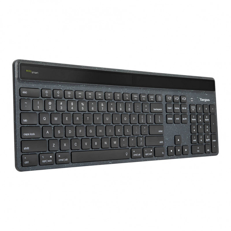 "Targus EcoSmart. Keyboard form factor: Full-size (100%). Keyboard style: Straight. Connectivity technology: Wireless, Device interface: Bluetooth, Keyboard key switch: Scissor key switch, Keyboard layout: QWERTY. Backlight type: LED. Recommended usage: Universal. Product colour: Black"\n"A keyboard for people and the environment. The Targus® Sustainable Energy Harvesting EcoSmart™ Keyboard is GRS certified and combines ultra-efficient Bluetooth® and advanced solar technologies. If you are on the hunt for an eco-friendly keyboard that doesn’t sacrifice size, this is it.