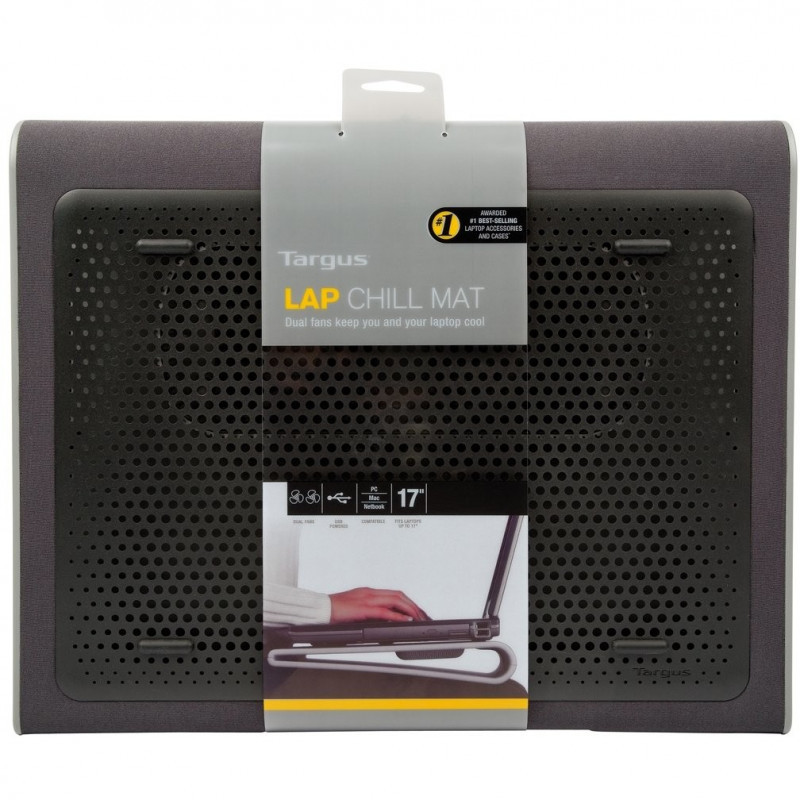 "Targus AWE55GL. Maximum screen size: 43.2 cm (17""), Number of built-in cooling fans: 2 pc(s), Minimum screen size: 38.1 cm (15""). Product colour: Black, Grey, Material: Neoprene, Plastic. Width: 54 mm, Depth: 380 mm, Height: 319 mm. Package width: 380 mm, Package depth: 54 mm, Package height: 305 mm. Shipping (inner) case width: 18 cm, Shipping (inner) case length: 38.5 cm, Shipping (inner) case height: 31.8 cm"\n"The Targus Lap Chill Mat provides a comfortable and ergonomic work surface to keep you and your laptop cool. The Chill Mat rests on your lap and disperses heat generated by the laptop, using dual fans to provide ventilation which can be obstructed if the laptop is used on a pillow or comforter. Simply plug the USB connector into the laptop to activate cooling. The ergonomic tilt makes typing easy while the soft neoprene material provides cushioned comfort on your lap. The open design allows fans to run quietly and stimulates constant airflow. Four rubber stops at the face of the Chill Mat prevent the laptop from slipping. The angled design combined with a soft neoprene construction ensures maximum comfort during extended periods of use and make using your laptop an enjoyable experience."
