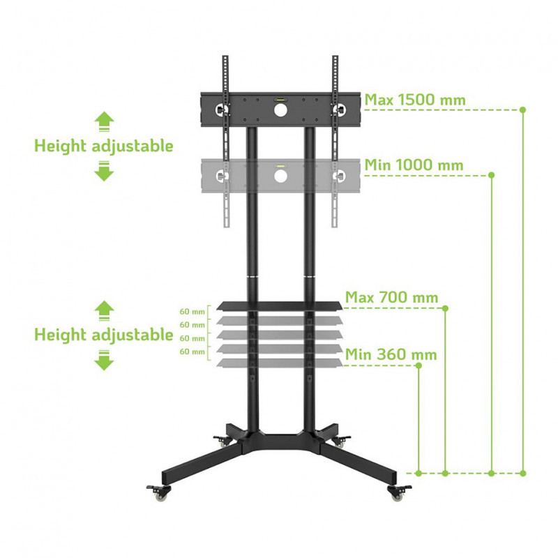 "Techly Floor Trolley with Shelf Support LCD / LED / Plasma 30-65"" ICA-TR6. Maximum weight capacity: 60 kg, Minimum screen size: 76.2 cm (30""), Maximum screen size: 165.1 cm (65""). Tilt angle range: -15 - 15°. Product colour: Black"\n"- Support for LED TV / LCD 30""-65"" (VESA supported: from 100x100 to 600x400)