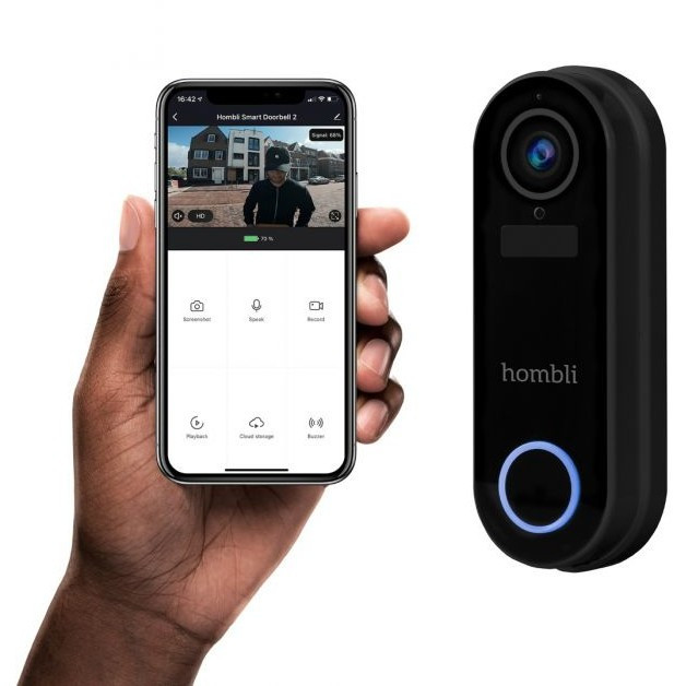 "Hombli Smart Doorbell Pack. Product colour: Black, White, Best uses: Home, Office, International Protection (IP) code: IP65. Compatible memory cards: MicroSD (TransFlash), Maximum memory card size: 128 GB. Maximum video resolution: 1920 x 1080 pixels, Field of view: 140°. Connectivity technology: Wireless, Wi-Fi standards: 802.11b, 802.11g, Wi-Fi 4 (802.11n), Frequency: 2400 MHz. Power source type: Battery, Battery type: Built-in battery, Battery capacity: 5000 mAh"\n"Take your smart home experience to the next level with the Hombli Smart Doorbell 2 and the Hombli Chime 2, the perfect combination. Always see and hear who’s at your door, now even faster and smarter. Including optional wired installation.