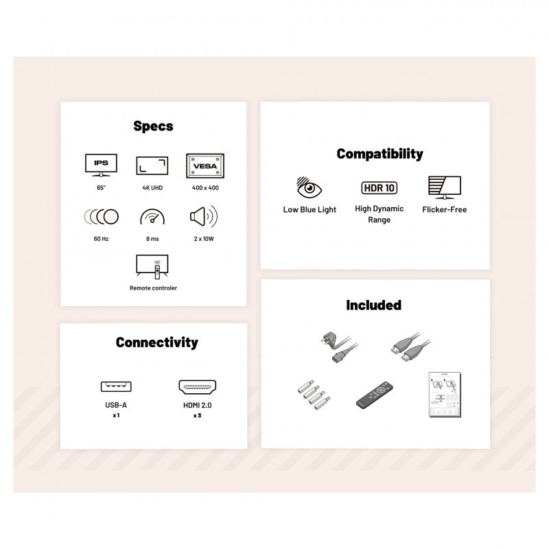 "JAPANNEXT JN-IPS650UHD60F. Display diagonal: 165.1 cm (65""), Display resolution: 3840 x 2160 pixels, HD type: 4K Ultra HD, Display technology: LCD, Response time: 8 ms, Native aspect ratio: 16:9, Viewing angle, horizontal: 178°, Viewing angle, vertical: 178°. Built-in speaker(s). VESA mounting. Product colour: Black"\n