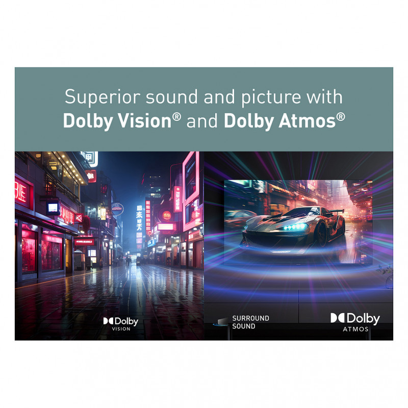 It elevates viewing experience by superior sound quality guaranteed by Dolby Atmos, with its immersive technology, that brings the viewer into the scene.