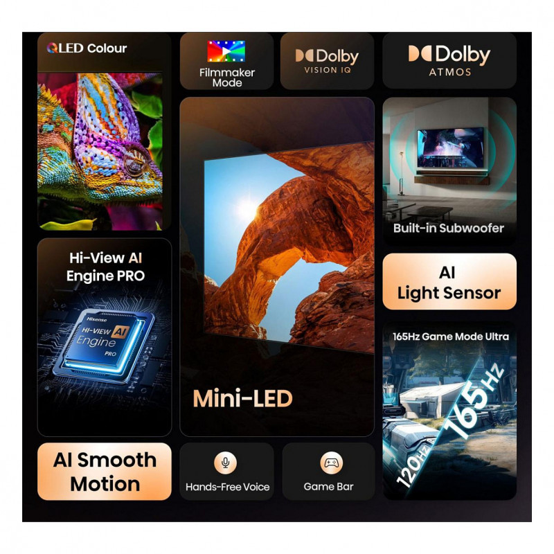 "Hisense 100"" U7QTUK MiniLED 144Hz Smart AI TV with Freely. Display diagonal: 2.54 m (100""), Display resolution: 3840 x 2160 pixels, HD type: 4K Ultra HD, Display technology: ULED, Screen shape: Flat, LED backlighting type: Mini LED. Smart TV. Display brightness: 450 cd/m², Response time: 6.5 ms, Contrast ratio (typical): 5000:1, Native aspect ratio: 16:9. Digital signal format system: DVB-C, DVB-S, DVB-S2, DVB-T, DVB-T2. Wi-Fi, Ethernet LAN. Product colour: Black"\n"The U7Q refines home entertainment with cutting-edge advancements in picture, sound, and smart technology. MiniLED PRO enhances brightness, contrast, and colour with precise dimming zones, supported by 144Hz panel technology and Mini-LED HDR1000. The Hi-View AI Engine upscales content in real time, while 144Hz Game Mode PRO with VRR and AMD FreeSync Premium PRO ensures ultra-smooth gameplay. Immersive audio is delivered through a built-in subwoofer, Dolby Atmos, and DTS Virtual X, creating a rich 2.1 channel surround sound. Quantum Dot Colour brings over a billion shades to life, while anti-reflection and wide-angle technology ensure Every Seat is a VIP Seat. Dynamic Tone Mapping and Dolby Vision IQ optimise HDR for stunning clarity in any lighting.The VIDAA U9 Smart Platform offers seamless access to Freely, Disney+, Netflix, and more, with Hands-free Voice Control and smart assistant integration. Filmmaker Mode and IMAX Enhanced bring cinematic visuals home, while Smart Gaming and Sports Mode ensure fluid action and realism. Sleek in design, the bezel-less U7Q features a Solar Remote for sustainable power. Go Greener initiatives, including adaptive light sensors and energy-saving modes, reduce environmental impact. WiFi, Bluetooth, and screen casting keep you connected. The U7Q is the next step in smarter, more immersive home entertainment.