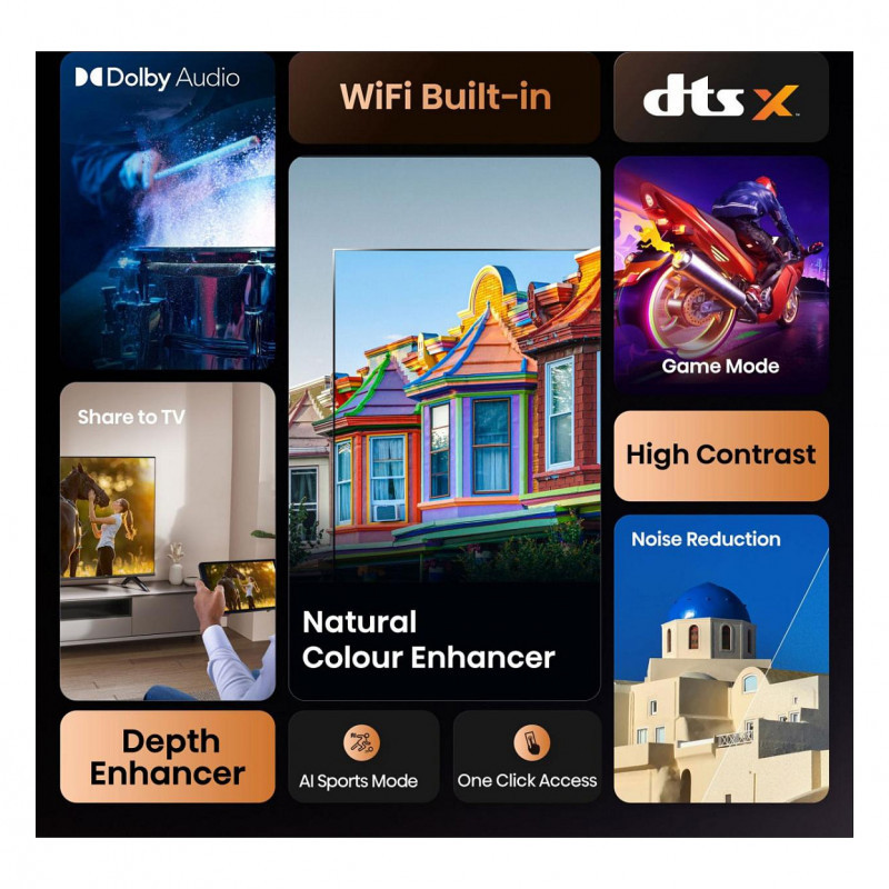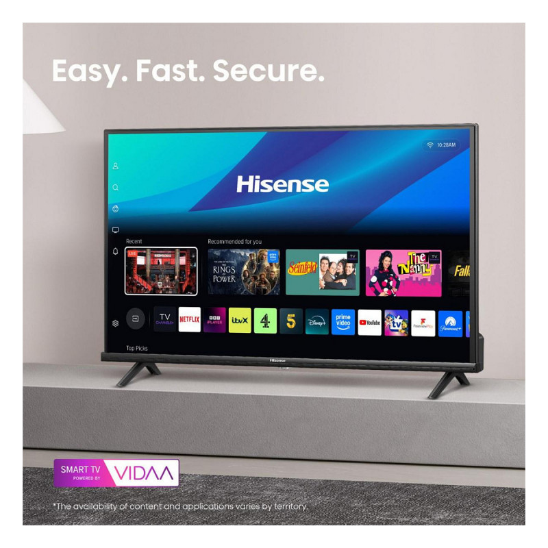 "Hisense 40A4Q. Display diagonal: 101.6 cm (40""), Display resolution: 1920 x 1080 pixels, HD type: Full HD, Display technology: DLED, Screen shape: Flat. Smart TV. Display brightness: 200 cd/m², Response time: 9.5 ms, Contrast ratio (typical): 5000:1, Native aspect ratio: 16:9. Digital signal format system: DVB-C, DVB-S2, DVB-T2. Wi-Fi, Ethernet LAN. Product colour: Black"\n