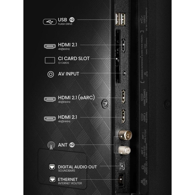 "Hisense 55E77Q PRO. Display diagonal: 139.7 cm (55""), Display resolution: 3840 x 2160 pixels, HD type: 4K Ultra HD, Display technology: QLED, Screen shape: Flat. Smart TV. Response time: 6 ms, Contrast ratio (typical): 3800:1, Native aspect ratio: 16:9. Digital signal format system: DVB-C, DVB-S, DVB-S2, DVB-T, DVB-T2. Wi-Fi, Ethernet LAN. Product colour: Black"\n