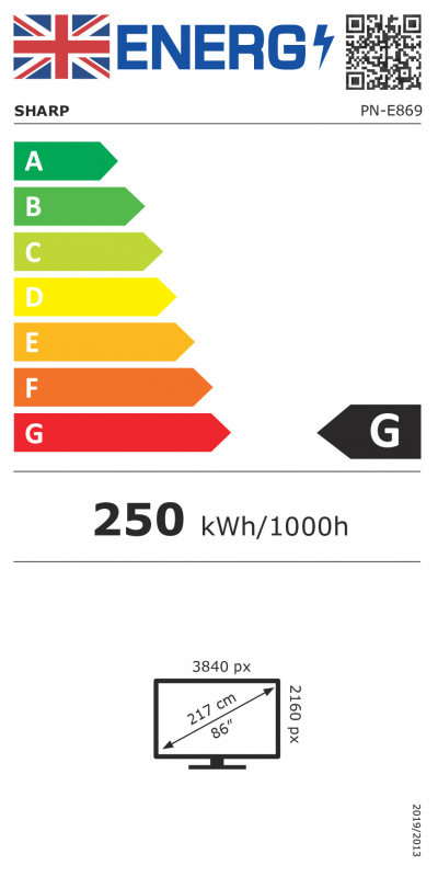"Sharp E869. Product design: Digital A-board. Display diagonal: 2.17 m (85.6""), Display technology: LED, Display resolution: 3840 x 2160 pixels, Display brightness: 350 cd/m², HD type: 4K Ultra HD. Operating hours (hours/days): 16/7. Product colour: Black"\n"Professional performance, affordable value