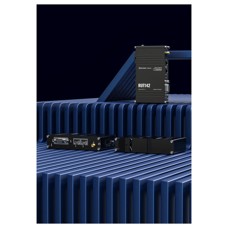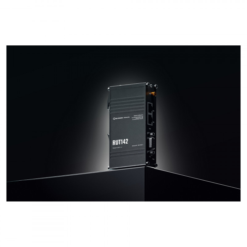 "Teltonika Industrial router RUT142 WiFi 4, RS232, 2x RJ45 100Mb/s, IP30. WAN connection type: RJ-45. Wi-Fi band: Single-band (2.4 GHz), Top Wi-Fi standard: Wi-Fi 4 (802.11n), WLAN data transfer rate (max): 300 Mbit/s. Ethernet LAN interface type: Fast Ethernet, Ethernet LAN data rates: 10,100 Mbit/s, Cabling technology: 10/100Base-T(X). Security algorithms: AES-CCMP, EAP-TLS, OWE, SSH, TKIP, WPA-PSK, WPA2-EAP, WPA2-Enterprise-PEAP, WPA2-PSK, WPA3-EAP,.... Product type: Industrial router, Product colour: Black, Housing material: Aluminium"\n"The RUT142 is a compact industrial Ethernet router, enhancing security through network isolation for end devices. Equipped with the RS232 serial interface, two Ethernet ports, DIN rail bracket, and an industrial 3-pin connector, it ensures seamless connectivity and easy installation. The router comes with RutOS, Wi-Fi 4, and supports industrial protocols such as Modbus, DLMS, DNP3, and OPC UA, and is compatible with RMS for efficient remote and on-site management."