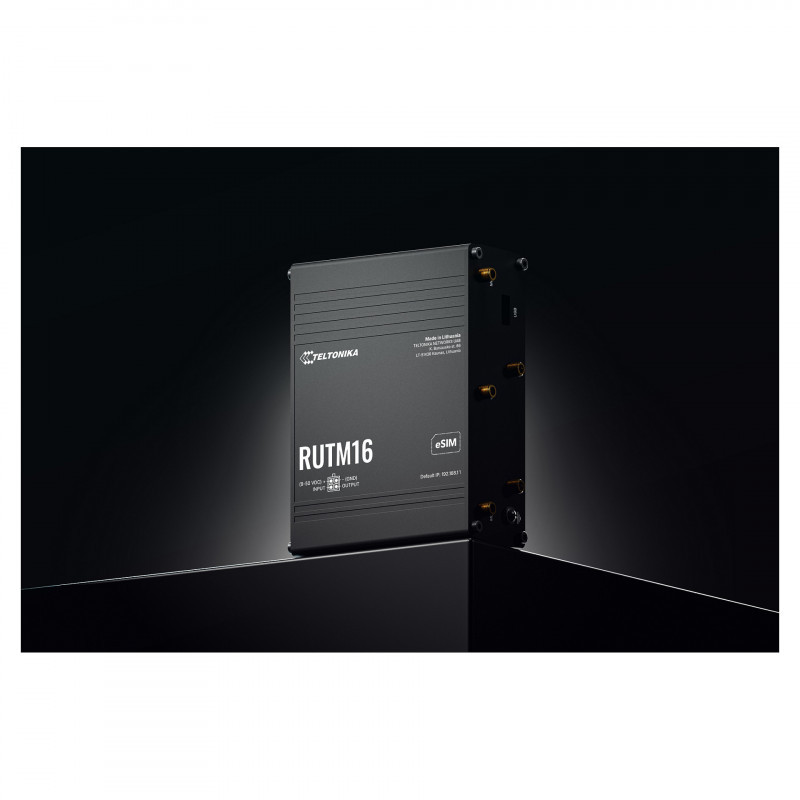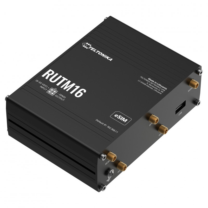 "Teltonika RUTM16. Device type: Cellular network router, Product colour: Black, Housing material: Aluminium. Ethernet LAN interface type: Gigabit Ethernet, Ethernet LAN data rates: 10,100,1000 Mbit/s, Networking standards: IEEE 802.11w, IEEE 802.11s, IEEE 802.11r, IEEE 802.11v, IEEE 802.11k, IEEE 802.3, IEEE 802.3u,.... Wi-Fi standards: 802.11b, 802.11g, Wi-Fi 4 (802.11n), Wi-Fi 5 (802.11ac), Wi-Fi band: Dual-band (2.4 GHz / 5 GHz), MIMO type: Multi User MIMO. Data network: 3G, 4G, 4G standard: LTE, SIM card type: MiniSIM + eSIM. USB port type: USB Type-A"\n"The RUTM16 is a versatile LTE router engineered for worldwide deployments. Ensure reliable global operation with its Telit modem, which provides Cat 6 speeds and coverage across multiple markets. For maximum versatility, connect IoT and industrial setups via robust 5x Gigabit Ethernet and USB ports, and enjoy stable wireless access with Dual-band Wi-Fi 5 featuring Mesh and Fast Roaming. Use the integrated eSIM to eliminate site visits by managing carrier profiles at scale. The RUTM16 is the ideal 4G router for large-scale applications like robotics, transport, roadside infrastructure, and POS terminals."