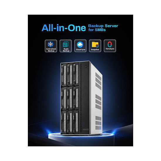 "TerraMaster T9-500 PRO. Type: NAS. Chassis type: Desktop. Device class: Home & Home Office. Processor family: Intel® Core™ i7, Processor frequency: 2.4 GHz. Internal memory: 16 GB, Internal memory type: DDR5. Total installed storage capacity: 0 TB"\n"High-Performance Backup Server: The T9-500 Pro NAS storage is powered by Core i7-1255U processor with 10 cores, 12 threads, and turbo speeds up to 4.7GHz. It features Iris Xe Graphics with a 1.25GHz dynamic frequency and supports AES NI hardware encryption. Equipped with 16GB DDR5 memory and dual 10 Gigabit Ethernet ports, it delivers strong performance. Its two M.2 NVMe slots enhance storage efficiency with Hyper Cache. This makes the T9-500 Pro a top choice for high-performance backup solutions for small to medium-sized businesses.
