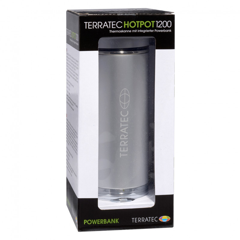 "Terratec HotPot 1200. Battery capacity: 1200 mAh, Battery technology: Lithium Polymer (LiPo). Output current: 0.6 A. Product colour: Silver"\n"The TERRATEC HotPot ist the must-have for every camping trip, dur to its innovative technoliogy. The smart thermos flask does not only house the power bank, it is also able to charge it without using any external energy source. The filled in hot liquid (from 80°C) generates power and charges the integrated battery. You can for example heat water over a campfire and use it as an energy source. A LED lamp with USB port makes it the perfect outdoor package."