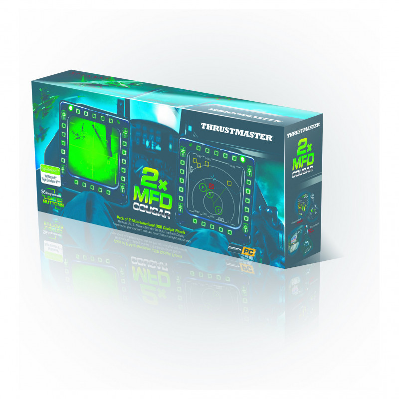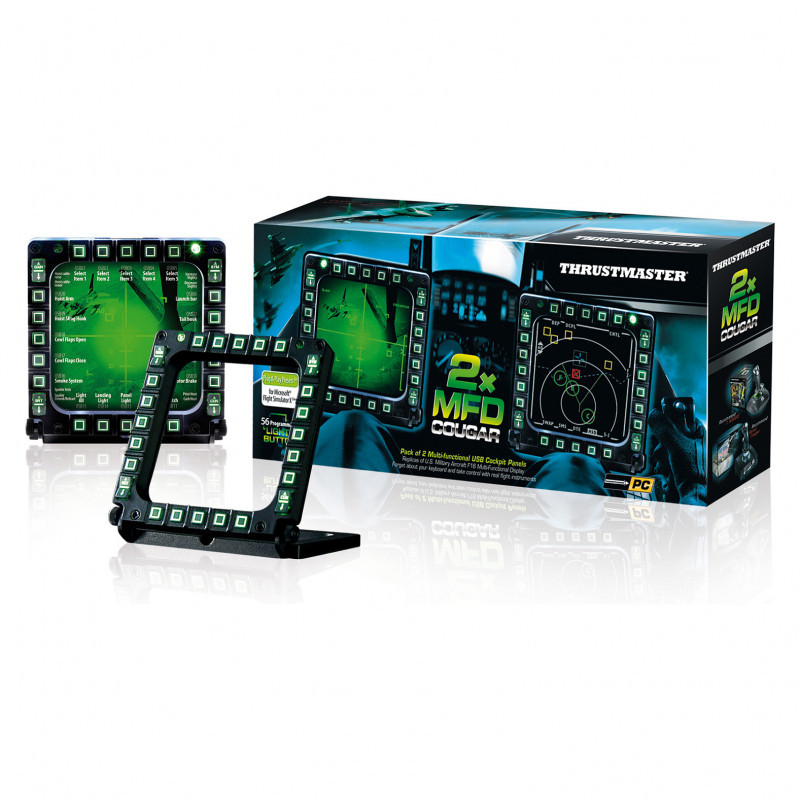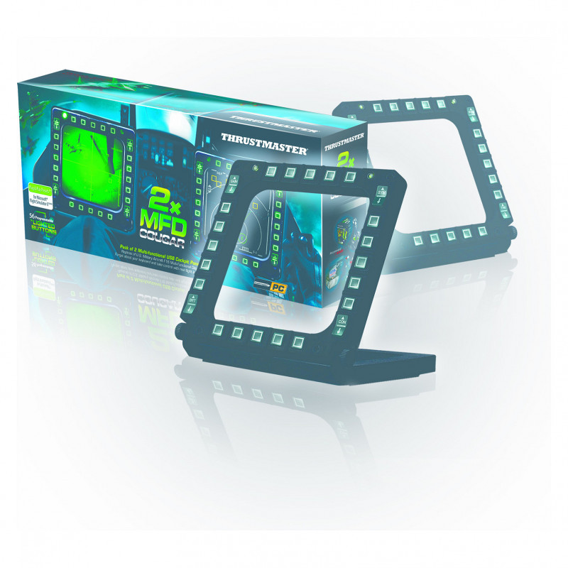 "Thrustmaster MFD Cougar Pack. Device type: Joystick, Gaming platforms supported: PC. Connectivity technology: Wired. Product colour: Black. Power source: Cable. Package width: 330 mm, Package depth: 65 mm, Package height: 150 mm"\n"Pack of 2 multifunctional ""USB Cockpit Panels"", replicas of the U.S. Air Force F-16 MFD*.