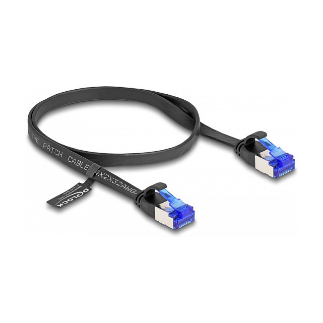 "DeLOCK RJ45 Flat Patch Cable plug to plug Cat.6A flexible 0.5 m black. Cable length: 0.5 m, Cable standard: Cat6a, Cable shielding: U/FTP (STP), Connector 1: RJ-45, Connector 2: RJ-45, Product colour: Black"\n"This network cable by Delock can be used to connect different networking devices, e.g. a NIC to a switch or a patch panel.
