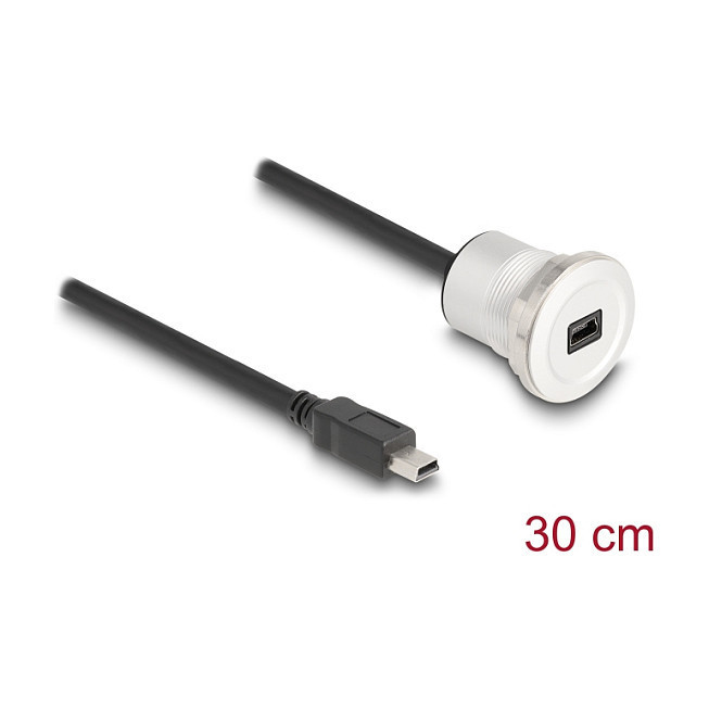 "DeLOCK 88186. Cable length: 0.3 m. Connector 1: Mini-USB B, Connector 2: Mini-USB B, USB version: USB 2.0, Product colour: Black, Silver"\n"This cable by Delock can be used e.g. for installation in a panel or housing with a suitable opening. It can also be used to extend and connect various USB devices."