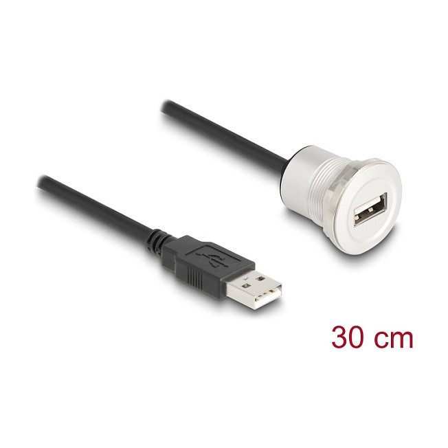 "DeLOCK 88181. Cable length: 0.3 m. Connector 1: USB A, Connector 2: USB A, USB version: USB 2.0, Product colour: Black, Silver"\n"This cable by Delock can be used e.g. for installation in a panel or housing with a suitable opening. It can also be used to extend and connect various USB devices."