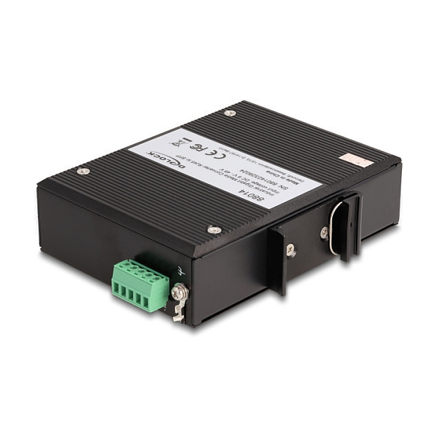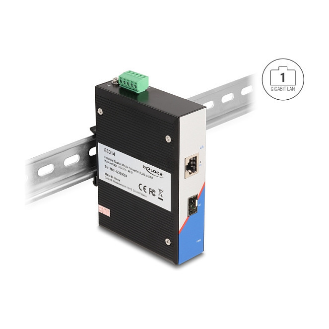 "DeLOCK Industrial Gigabit Media Converter RJ45 to SFP for DIN rail. Switch type: Unmanaged. Basic switching RJ-45 Ethernet ports type: Gigabit Ethernet (10/100/1000), Basic switching RJ-45 Ethernet ports quantity: 1, Installed SFP modules quantity: 1. Switching capacity: 1 Gbit/s. Networking standards: IEEE 802.3, IEEE 802.3ab, IEEE 802.3u, IEEE 802.3z. Rack mounting"\n"This robust, industry capable Gigabit Ethernet media converter by Delock can be used to expand a network with an optical fiber interface. In the SFP slot, an optional 1 Gbps SFP module can be used.