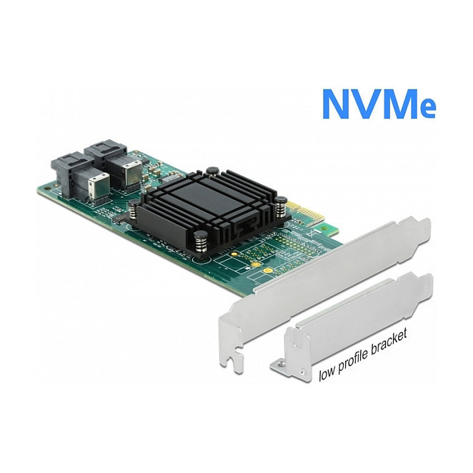 "DeLOCK PCI Express x8 Card to 2 x internal SFF-8643 NVMe - Low Profile Form Factor. Host interface: PCIe, Output interface: Mini-SAS HD, Expansion card form factor: Low-profile. Data transfer rate (max): 32 Gbit/s. Windows operating systems supported: Windows 10, Windows 10 x64, Windows 7, Windows 7 x64, Windows 8.1, Windows 8.1 x64. Package type: Box"\n"This PCI Express card by Delock expands the PC by two SFF-8643 interfaces. SSDs with e.g. U.2 interface can be connected to these ports by using an optional cable."