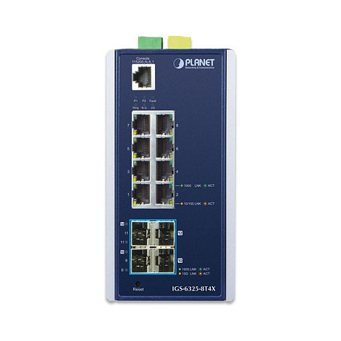 "PLANET IGS-6325-8T4X. Switch type: Managed, Switch layer: L3. Basic switching RJ-45 Ethernet ports type: Gigabit Ethernet (10/100/1000), Basic switching RJ-45 Ethernet ports quantity: 8, Console port: RJ-45. Full duplex. MAC address table: 16000 entries, Switching capacity: 96 Gbit/s. Networking standards: IEEE 802.1D, IEEE 802.1Q, IEEE 802.1ab, IEEE 802.1ag, IEEE 802.1p, IEEE 802.1s, IEEE 802.1w, IEEE.... DC input voltage: 12 - 48 V. Wall mountable"\n"10Gbps Fiber Ports and Multiple Dual Speed Ports Deliver High-speed Networking
