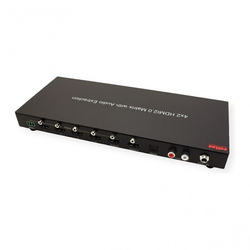 "ROLINE 4K HDMI Matrix Switch, 4 x 2, with Remote Control. Product type: AV matrix switcher, Maximum resolution: 3840 x 2160 pixels. Width: 270 mm, Depth: 111 mm, Height: 32 mm"\n