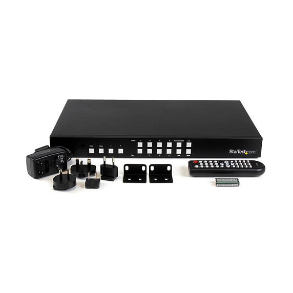 "StarTech.com 4x4 HDMI Matrix Switch with Picture-and-Picture Multiviewer or Video Wall. Video port type: HDMI. Material: Aluminium, Product colour: Black, Supported graphics resolutions: 1280 x 720 (HD 720), 1920 x 1080 (HD 1080), 1920 x 1200 (WUXGA), 640 x 480 (VGA). AC adapter input voltage: 100 - 240 V, AC adapter input current: 1 A, AC adapter output voltage: 12 V. Certification: CE, FCC, TAA. Width: 250 mm, Depth: 436 mm, Height: 49 mm"\n"Share and switch four distinct HDMI audio/video sources between four HDMI displays, with optional Picture-and-Picture