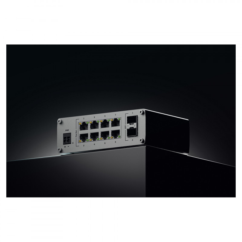 "Teltonika TSW200. Switch type: Unmanaged. Basic switching RJ-45 Ethernet ports type: Gigabit Ethernet (10/100/1000), Basic switching RJ-45 Ethernet ports quantity: 8. MAC address table: 2000 entries, Switching capacity: 20 Gbit/s. Networking standards: IEEE 802.3i, IEEE 802.3u, IEEE 802.3ab, IEEE 802.3x, IEEE 802.3az, IEEE 802.3af, IEEE 802.3at. DC input voltage: 7 - 57 V. Power connector: DC-in jack. Power over Ethernet (PoE). Wall mountable"\n"TSW200 is an industrial Ethernet switch with 2 SFP ports for long-range Fiber-optic communication and 8 Gigabit Ethernet ports that support IEEE802.af and IEE802.3at Power-over-Ethernet standards. Classified as power source equipment (PSE), it enables the centralization of the power supply, providing up to 30 watts per port and reducing the effort to install power."